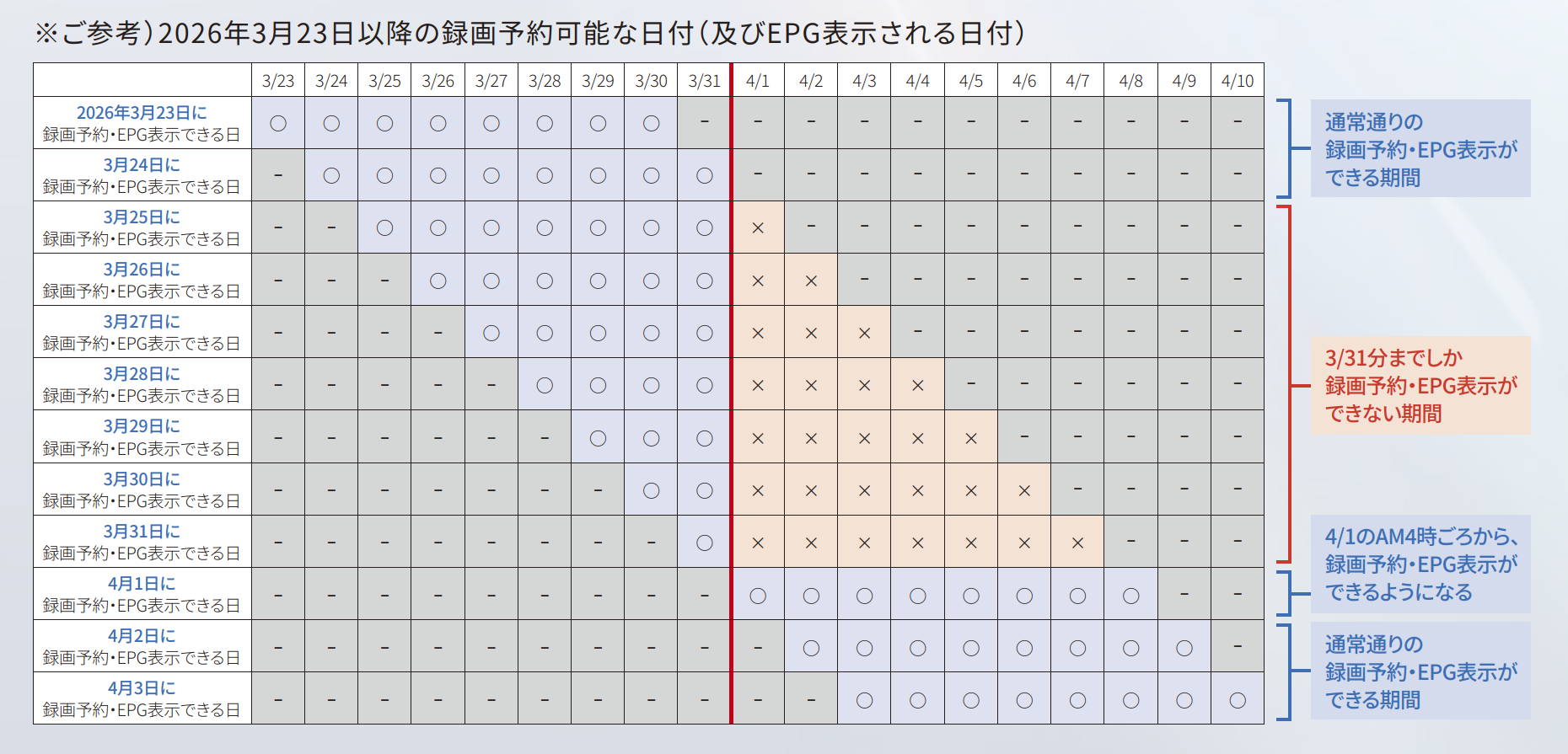 4月1日(水)以降の番組表は、同日午前4時(予定)まで表示されません。そのため、事前の録画予約ができなくなります。